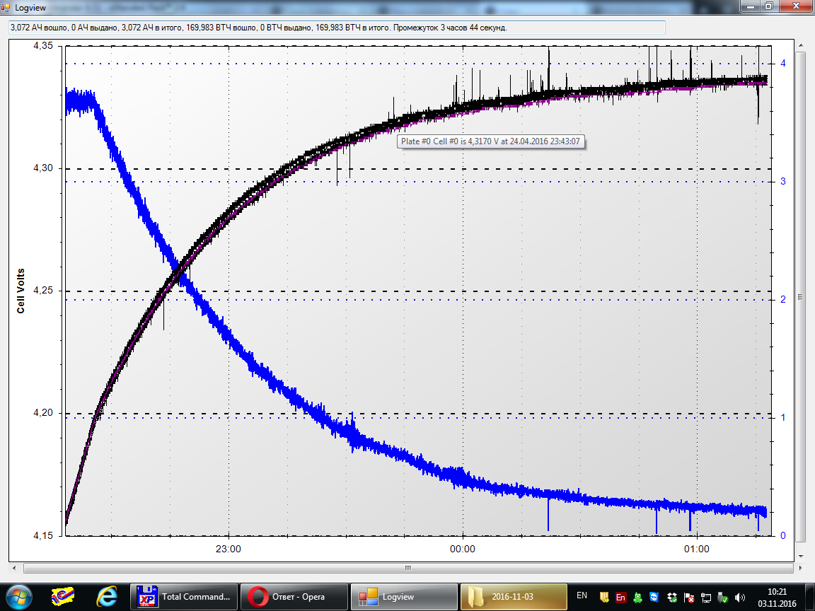 Вот пример зарядки LG D1 - на зарядке выставлено ограничение  3,7 ампера и 4,34 вольт на банку. с 4.2 и дальше - ток падает до 1 ампера. 4.3 - 4.34 добиваются током 1-0.2 ампера. балансировка 1.2 ампера.