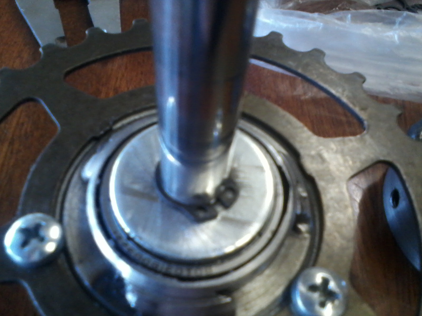 Попробовал болгаркой сделать паз и засадить шпонку, получилось коряво, плюнул на это дело, и посадил на прихватки полуавтоматом.С другой стороны на валах сделал проточки установил стопорные кольца, тем самым прижав вал со звездой к подшипнику.