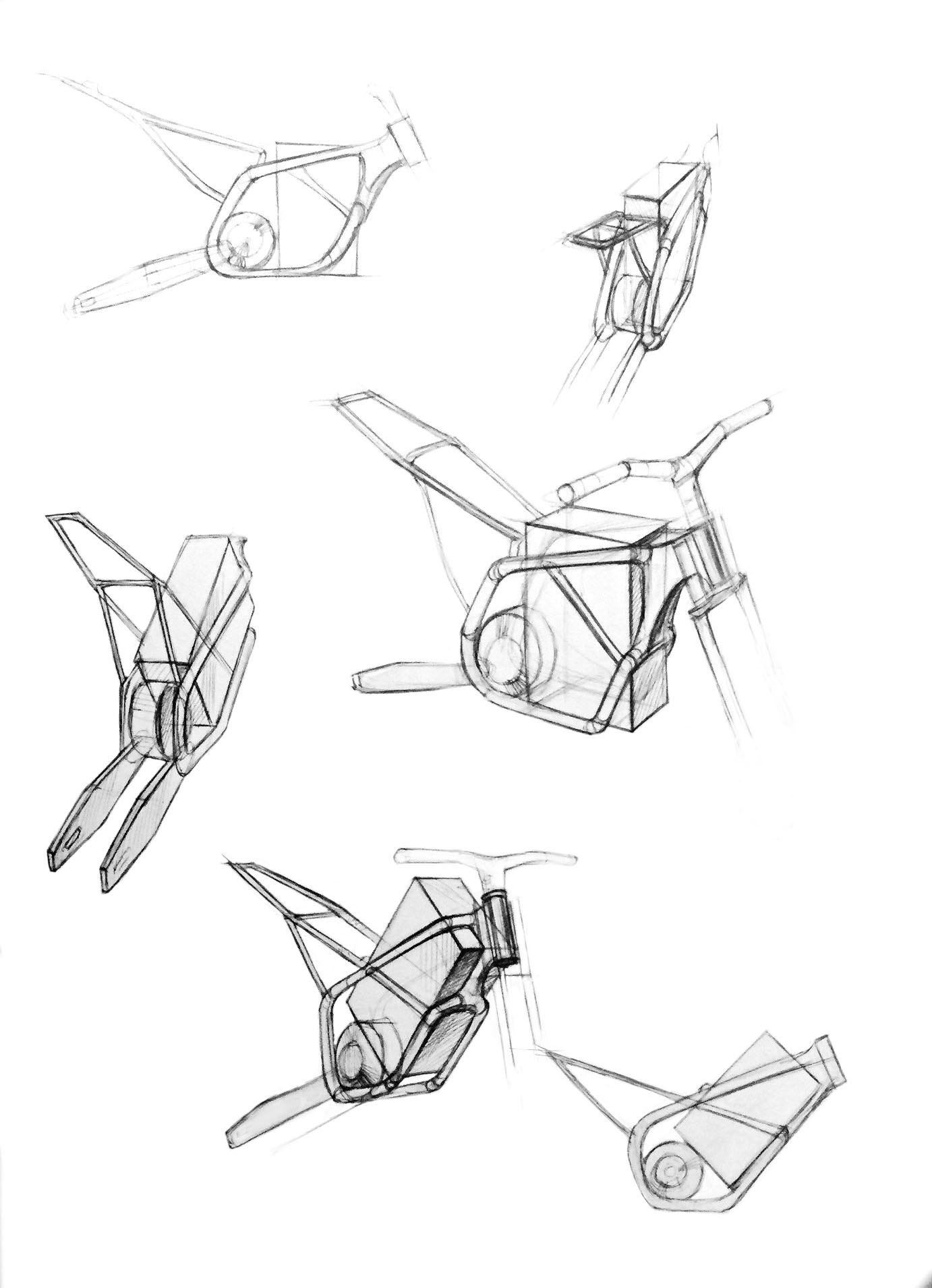 Если проект не "с нуля", то нужно на слово поверить тем кто уже создал рамы (принять их физику), выбрать тип проектируемого мотоцикла. На сколько я понял Вы выбрали мотард. Далее нужно приблизительно скопировать наиболее удачную конструкцию известной фирмы, зафиксировав в своем проекте узловые точки конструкции, далее выбрать материал рамы (магниевый сплав, карбон, сталь, алюминий или титан), на этом этапе можно заняться дизайном с учетом приобретаемых комплектующих деталей.