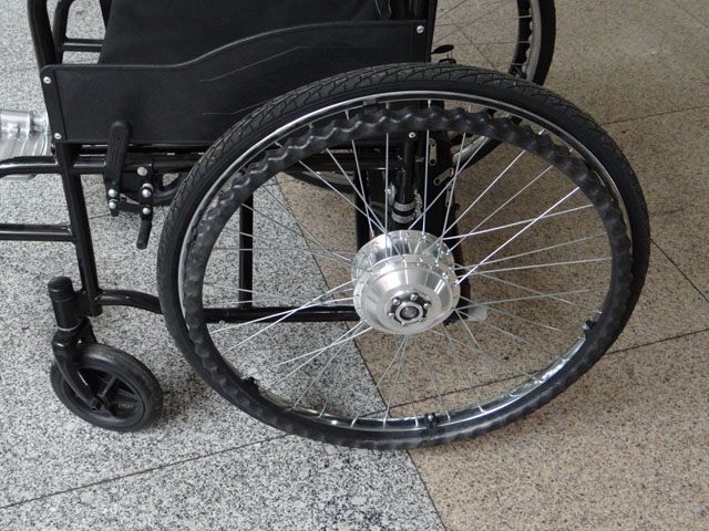 Цитата: "...Вначале решили  установить одно редукторное мотор колесо вместо ступицы заднего колеса коляски. Для этого ось с одной стороны мотор колеса  аккуратно отрезали на фрезерном станке  до основания, затем заспицевали мотор колесо 24 вольта 250 ватт,  в стандартный обод от коляски диаметром 24 дюйма. Так как диаметр мотор колеса гораздо больше втулки оси, которую мы удалили, - пришлось заменить спицы, -  на  более короткие.  Далее, мотор колесо с ободом, - установили вместо штатного колеса. Для того, чтобы оно не проворачивалось в месте крепления к раме коляски, ось мотор колеса  дополнительно зафиксировали с помощью универсального усилителя вилки Вольта байкс..."