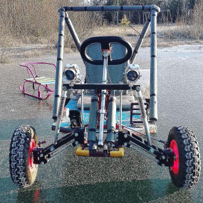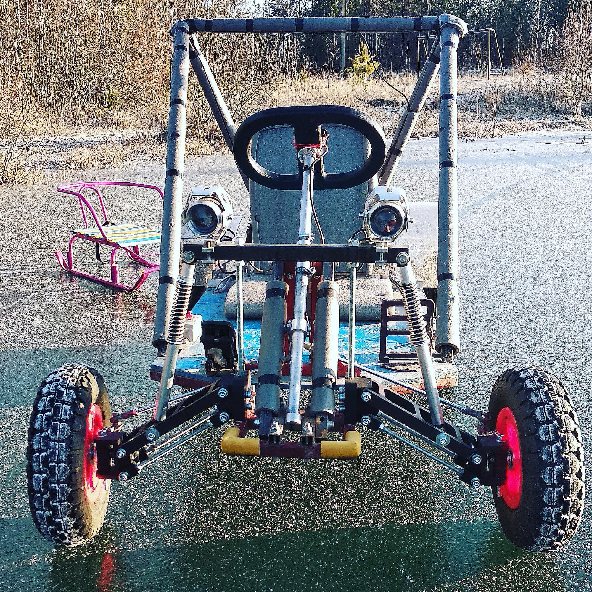Были опробованы цепи на колесах.  На укатаном снегу,результат очень хороший. В планах 4*4 и переделка рамы. Уж больно тесная она и не удобная для детей.