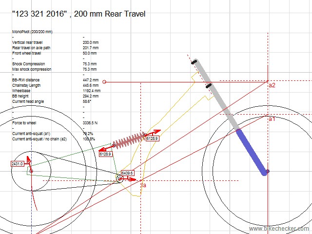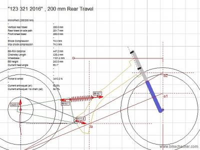 [user]ArtemT[/user], я прикинул по вашей картинке, если у вас нарисован аморт 240мм, то при ходе задней подвески 200мм, у вас рабочий ход амортизатора 63мм ( у амортизаторов 240мм, нормальный рабочий ход 73-76мм)  Соответственно реальный ход задней подвески будет более 200мм. Передние велосипедные вилки с ходом более 200мм найти не реально, это олдскульная DH тема. Ни в каких велосипедах или внедорожных мотоциклах я не встречал, чтобы ход задней подвески был больше передней. Чаще наоборот бывает. Только у LMX есть такое, вы наверно оттуда точки и скопировали. Я бы увеличил расстояние В, чтобы на полном ходе аморта, ход задней подвески был 200мм. Дорисуйте колесо переднее, мне нужны точки осей, загружу в линкейдж, дам вам всякие графики  и нагрузки по точкам, если интересно.