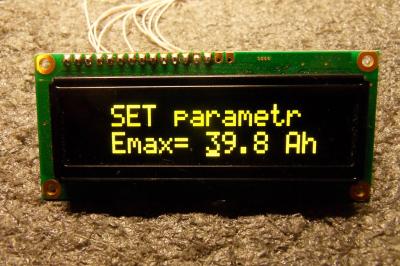 Под ней -  текущий заряд батареи в процентах от максимума (масштабирование автоматическое после однократной ручной установки параметра Emax  в меню установок (см. дальше)).