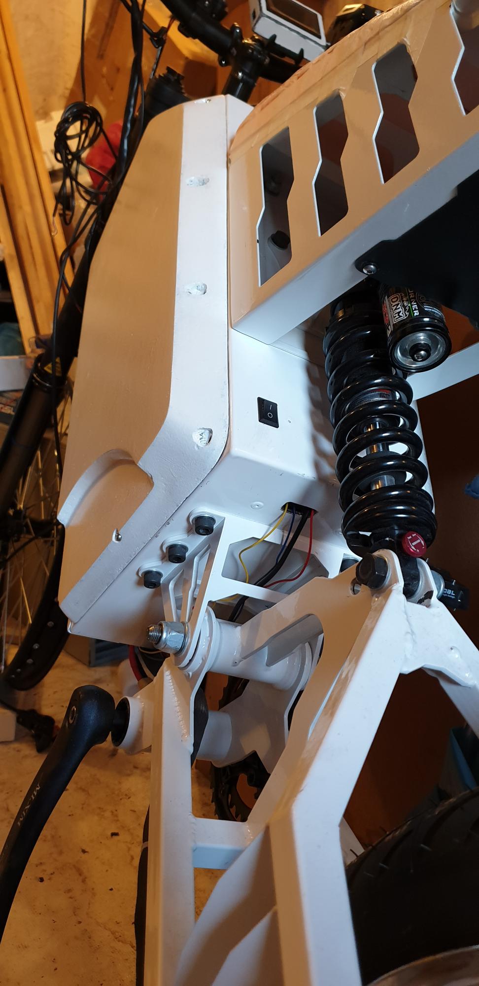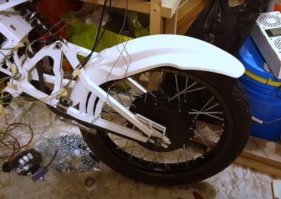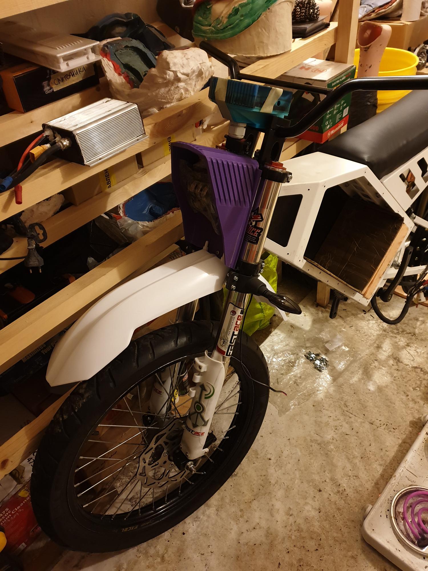 [user]tmkt[/user], верно, в том году оно смотрелось так, на велокомпонентах, в этом сезоне вот заморочился (фото готового пока нет), но все это ради норм переднего тормоза на самом деле, тк задолбался колодки менять, да и велотормоза не вывозили совершенно, такой паровоз останавливать. Мото передний тормоз, значит и крепление под него нужно соответствующее, а это перья вилки и под мотодиск понятное дело нужна мотоступица, то есть это уже полноценное 21" колесо. Обода тоже по случаю купил наконец Takasago Excel, задушил жабу, но они офигенные конечно, ровные идеально. Мотоколесо и перья вилки потянули за собой мото-траверсу, а в нее разумеется ставим мото-руль и все, это уже считай мотик. Туда замоделил еще козырек для фары, приборку с экранчиком от ант бмс, поворотники и что-то еще по мелочи.
