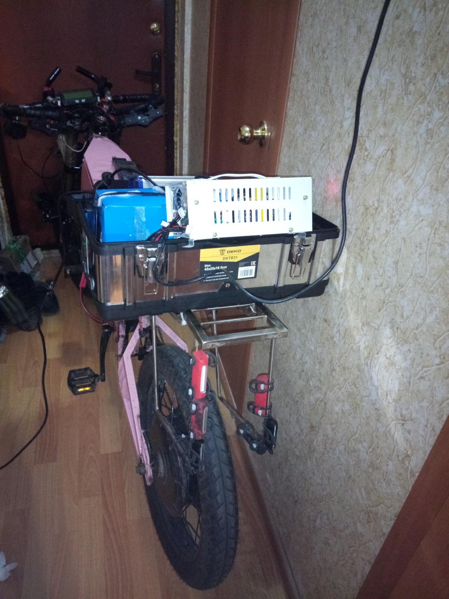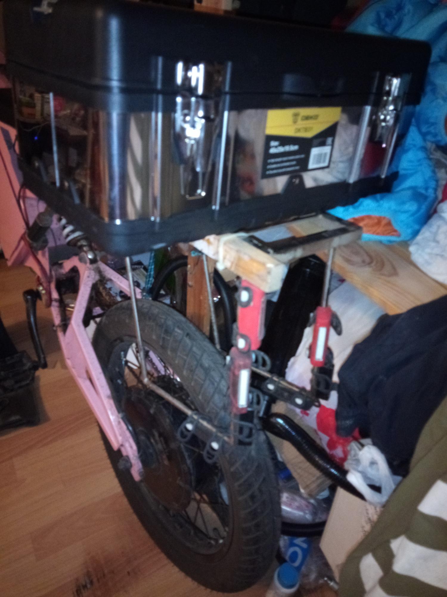 очевидный плюс по сравнению с предыдущей системой "батарея вдоль", теперь байк значительно удобнее прислонять куда-либо :exactly: и ящик получился не шире руля, так что и в пробках можно уверенно ездить.