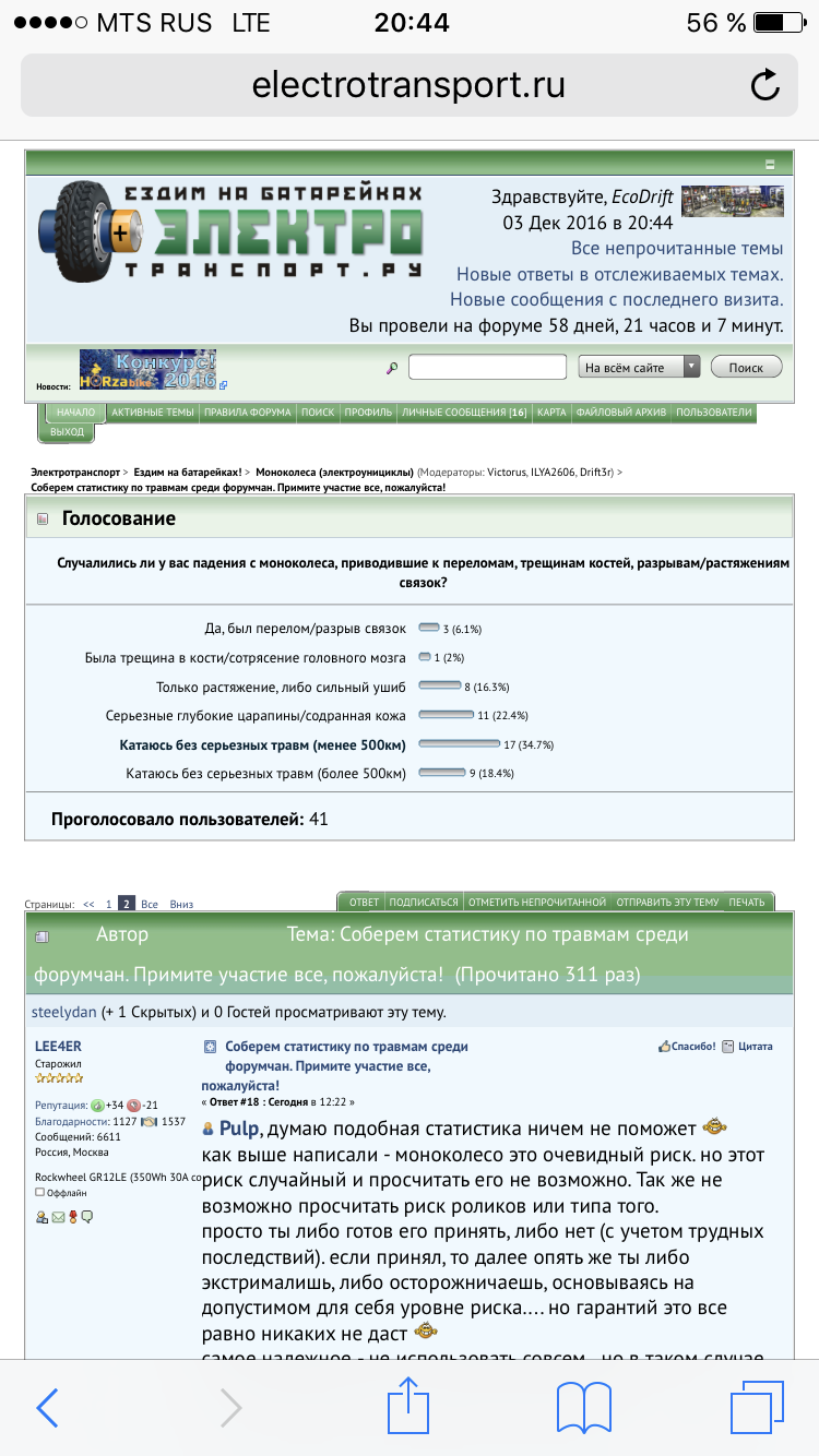 Стаж -1год.Возраст-62.Прошлую зиму катал в закрытом помещении(в электроклубе)За сезон сменил два колеса(пробег на первых двух -350 км.)На КС-16 проехал более 1000км.Серьезных падений не было,при всех падениях  обходилось пробежками оставался на ногах. Стараюсь сильно не экстрималить,хотя всегда езжу на предельных скоростях.(Понимаю сколько мне лет , свои возможности и -возможности колеса.)Бросать пока не планирую.Да!Чуть не забыл -катаю всегда в защите!(Стал одевать после первого продавливания колеса - когда пробежался на скорости за 20 км.-понял,что в следующий раз может так не повезти.)