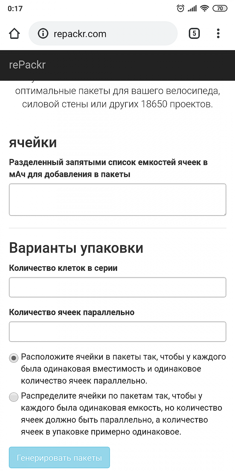 При группировке параллельных банок учитывать сопротивление желательно, но также будет присутствовать вопрос о том, что при этом лучше учитывать больше, внутреннее сопротивление или же нынешнюю ёмкость элементов. Смотрите, к примеру, вот один образованный чел ориентируются именно на ёмкость, для чего и разработали специальную программу, с помощью которой можно выравнивать именно ёмкость (а Rвн при этом у элементов запросто может друг от друга отличаться) http://repackr.com  После внесения данных о ёмкости приготовленных для сборки будущей батареи элементов, в следующей строчке пониже проставьте количество S и ещё ниже количество Р. А затем, после нажатия кнопки "генератор" на этой же странице вы получите нужные данные, которые помогут выравнять по ёмкости целые ячейки со своими банками,  Чтобы сократить ваше время на догадки, могу подсказать не забывать ставить запятые сразу после внесения данных о ёмкости аков, а образец будет ниже
