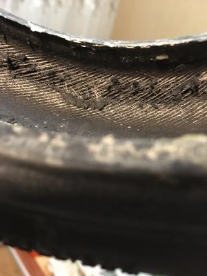 [user]Samokat[/user], это ещё повезло, что корд не сильно выпер, но это не значит, что на проклеенных на спущенных можно ездить, за давлением все равно следить надо, хоть и жрать камеру перестаёт, если давление нормальное, на слабом давлении, а тем более на спущенных, корд просто отслаивается от покрышки, держите ужастик: