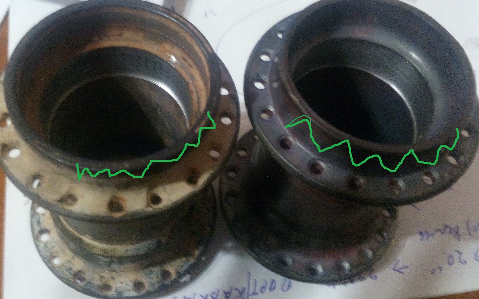 По фотографиям кажеться что у вас стоит такаяже втулка ,но у неё полностью срезан буртик(то что отмеченно красным)