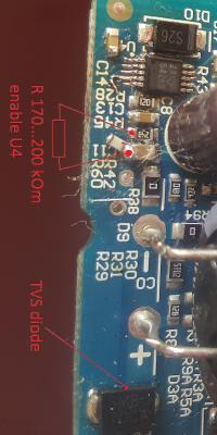 на всякий случай впаял защитный TVS диод, лучше ставить вольт на 55, поставил что было под рукой, лучше чем ничего.