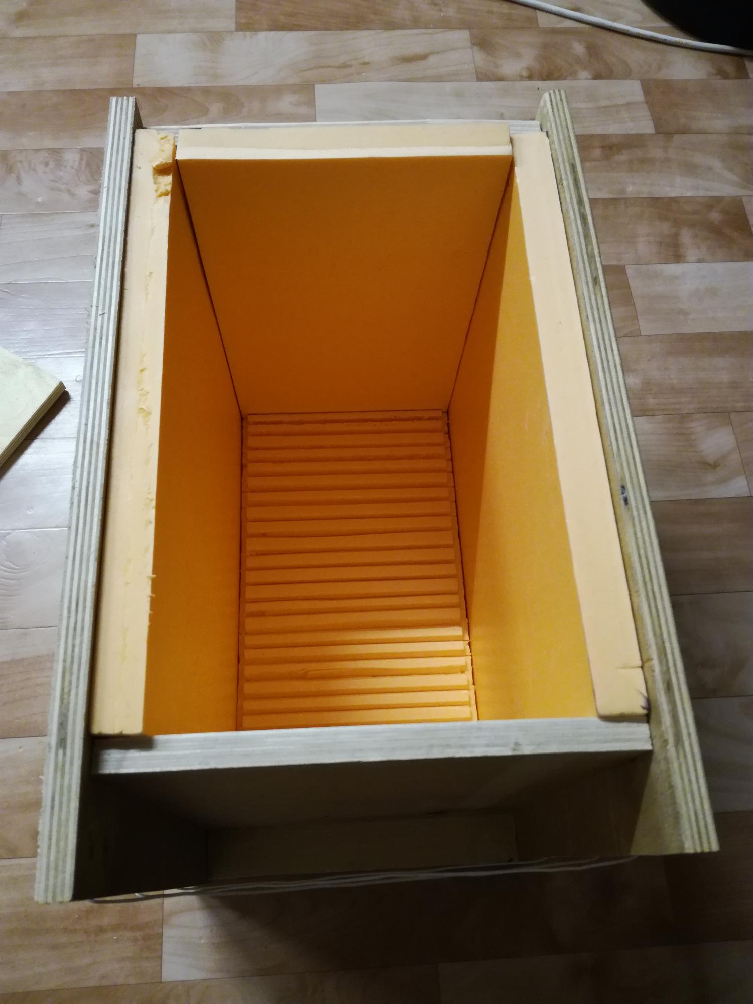 Жёлтый - пенополистирол. Фанера - 10 мм. Боковые щёчки (если смотреть вертикальную конфигурацию) будут сжиматься шпильками в шести точках (углы и на уровне середины  пакетов). Шпильки будут проходить сквозь прорези в пенополистироле.