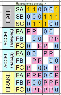 Собственно по этой таблице пытался делать активное торможение обратным напряжением (назад).