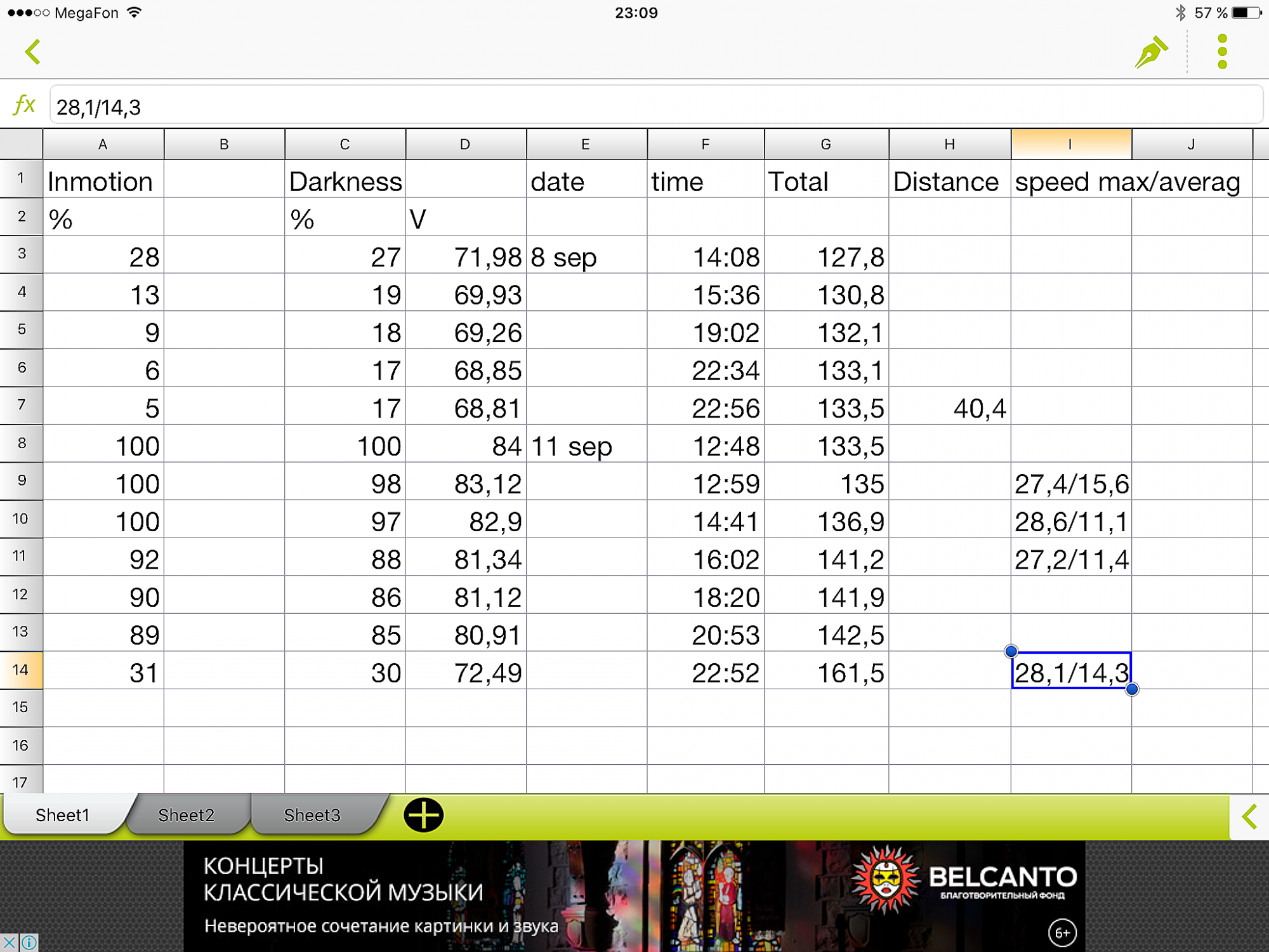 Илья, вот результаты замеров за сегодняшний день. Все шло плавно, потом под вечер сорвался с Проспекта Мира на ВДНХ. 20 с лишним км откатал, с немалой скоростью. Естественно когда ехал на ВДНХ забыл про замеры, пытался не слететь на кочке. Поэтому в статистике вольтажа провал - с 80 до 30%.