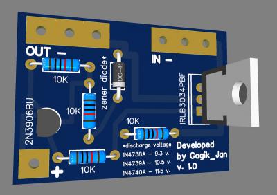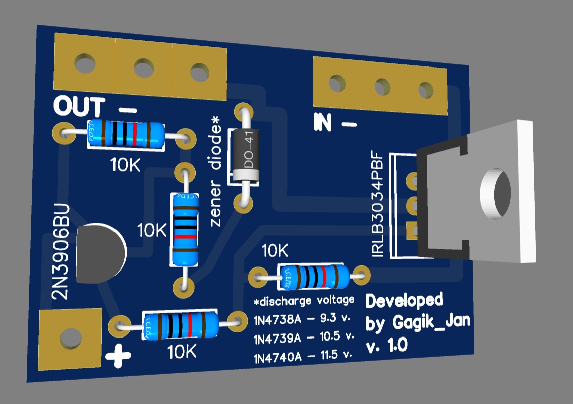 В данной схеме применён силовой ключ на базе полевого транзистора, например IRLB3034 (максимальный ток 195 A), который работает как реле и размыкает минусовую клему при падении напряжения ниже установленного порога, который устанавливается подбором стабилитрона, а именно 1N4738A - отсечка 9.3 в., 1N4739A - отсечка 10.5 в., 1N4740A - отсечка 11.5 в.