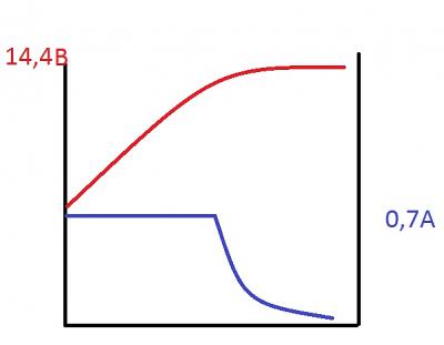До 14,4В держит ток до 0,1С, потом постепенно ток снижается, а напряжение держится на 14,4В.