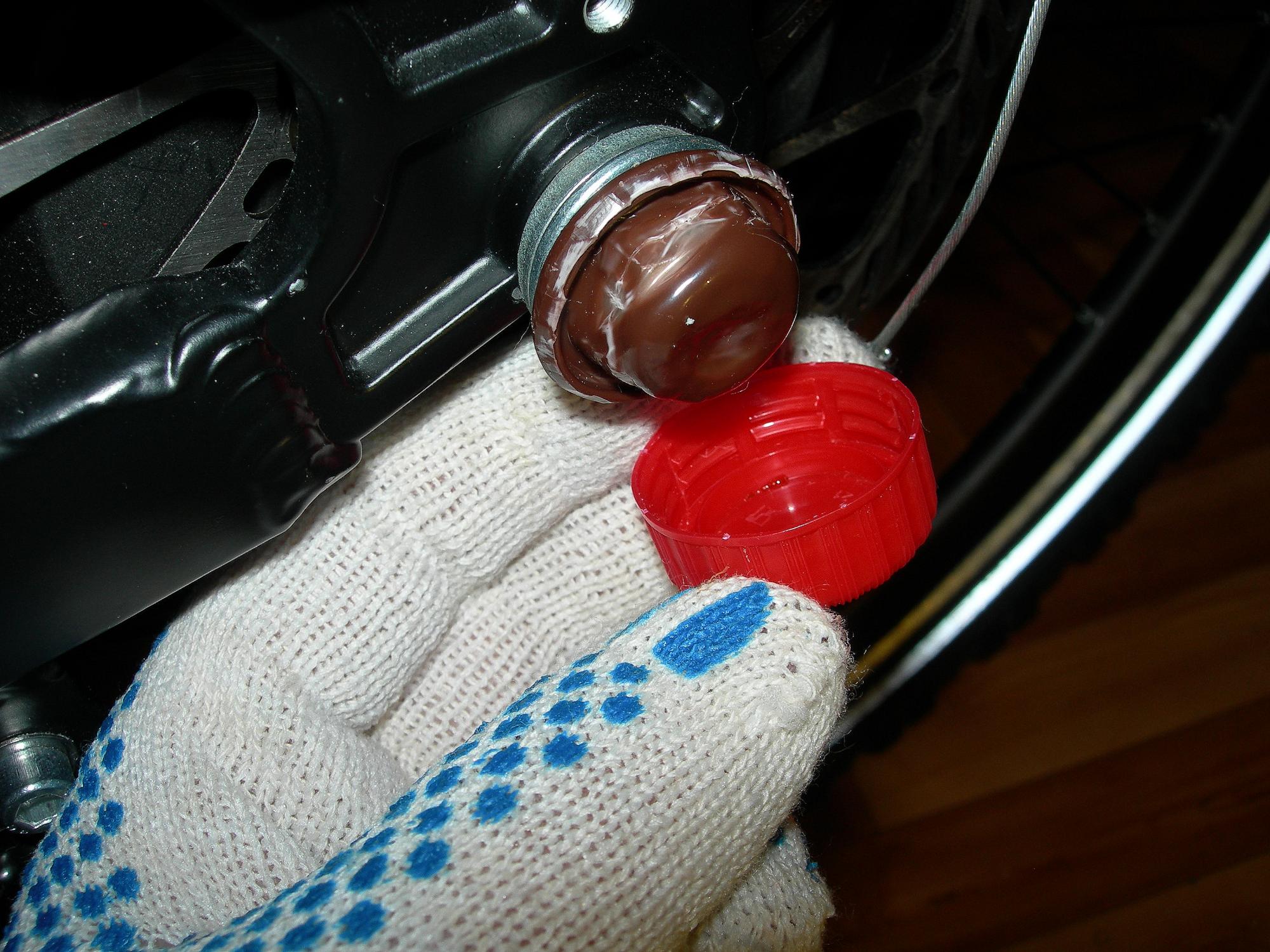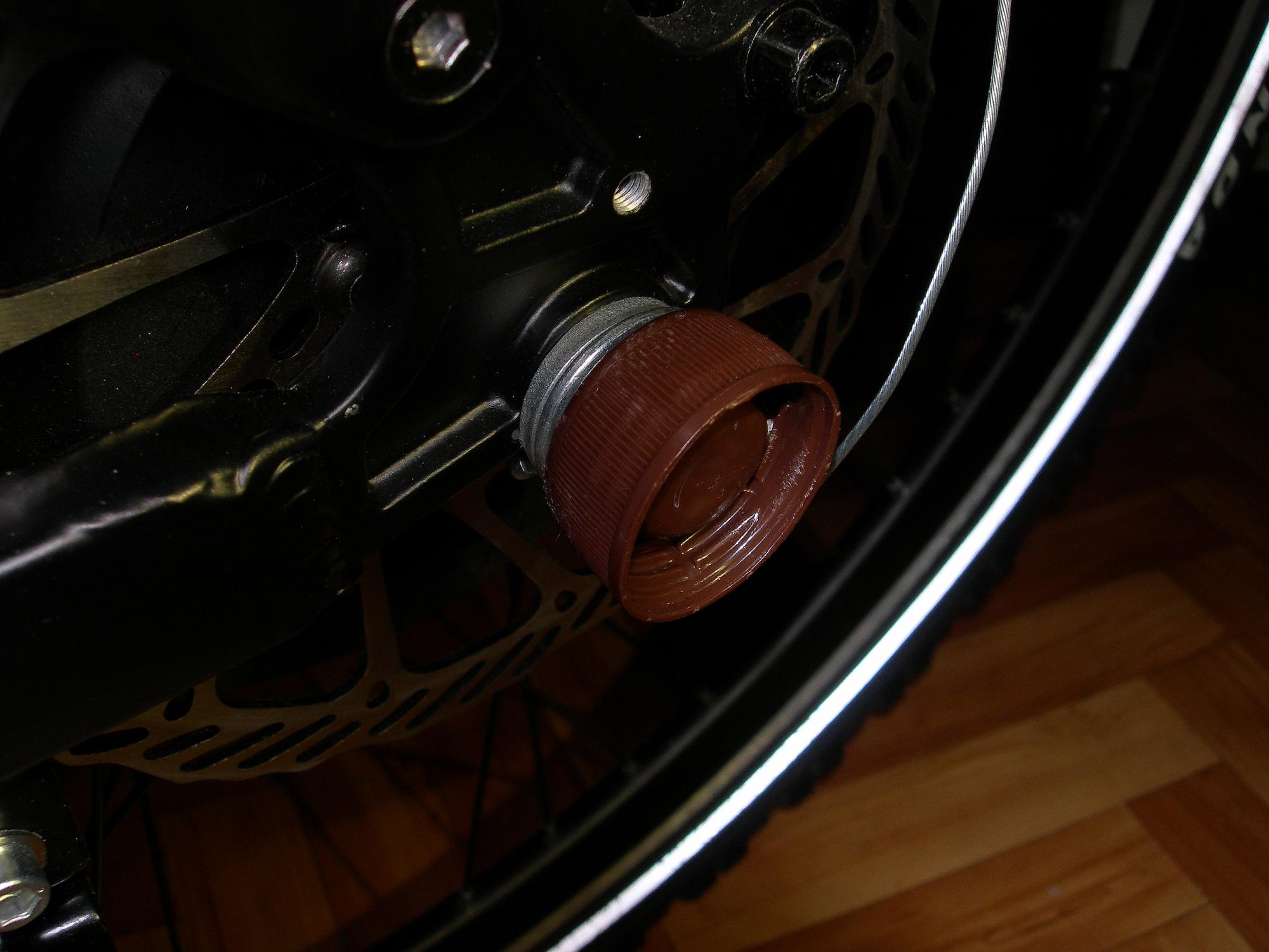 Решил обезопасить вилку от появления новых царапин при складывании рамы, сделал колпачок на ось заднего колеса + обтянул подножку термоусадкой.