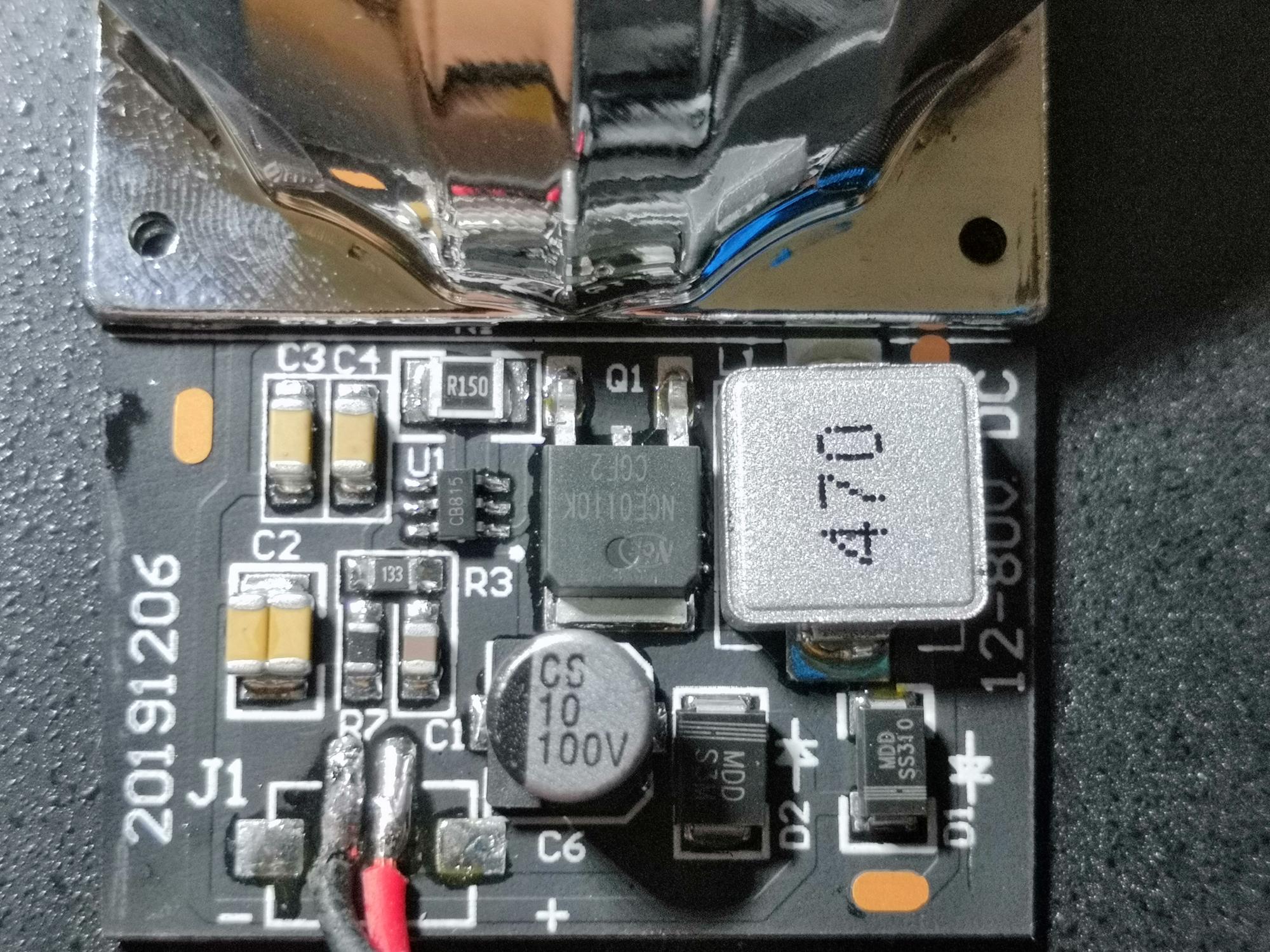 Плата со светодиодом и драйвером выполнена на медной подложке. Микросхема драйвера FP7175.
