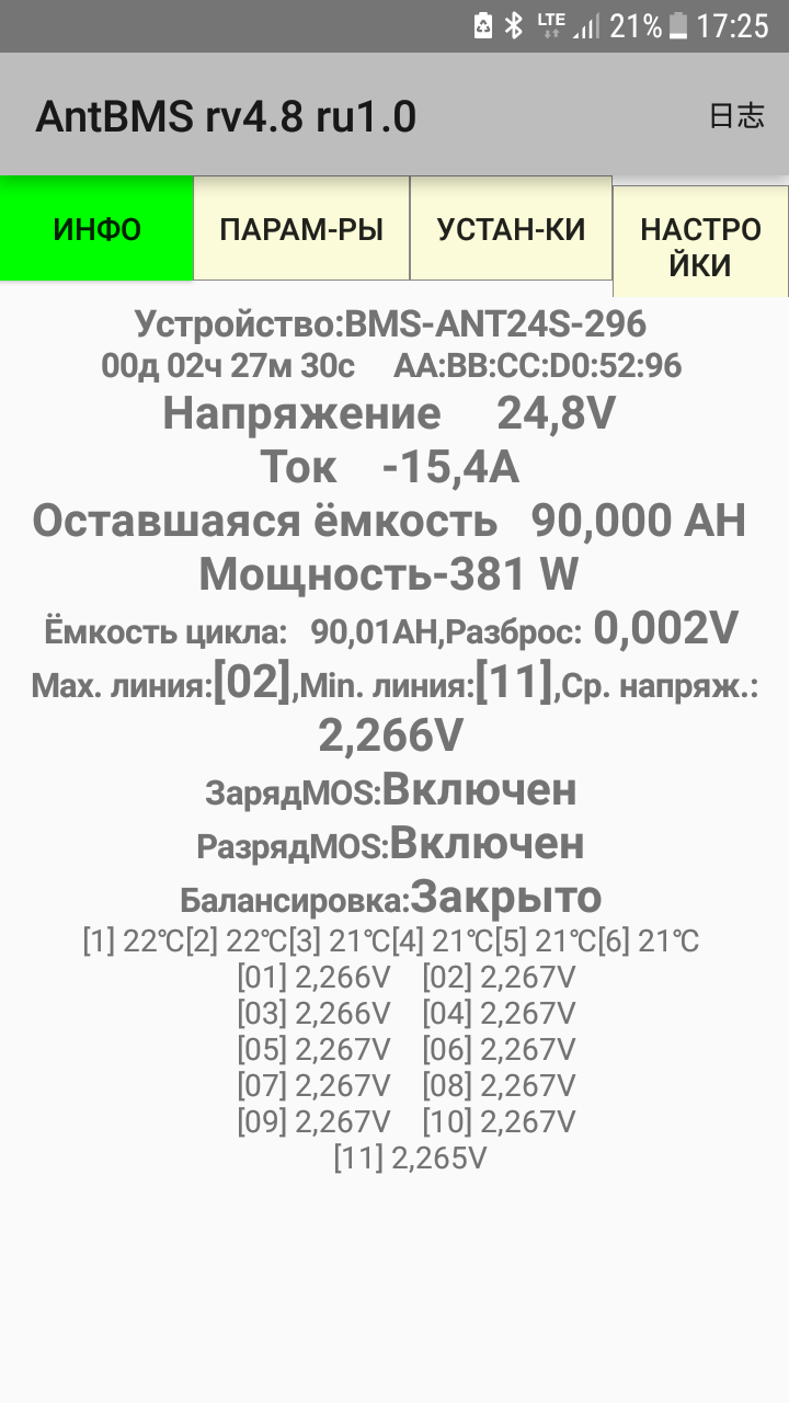 А вообще ... Я отмучился с софтом который мне прислал продаван китайский.. Почитал форум и нашел русскую прогу под бмс для телефона.. И я скажу что сейчас мне все нравится.. Бмс работает.. Балансировка и все такое.. Мне все нравится.. Батка получилась..
