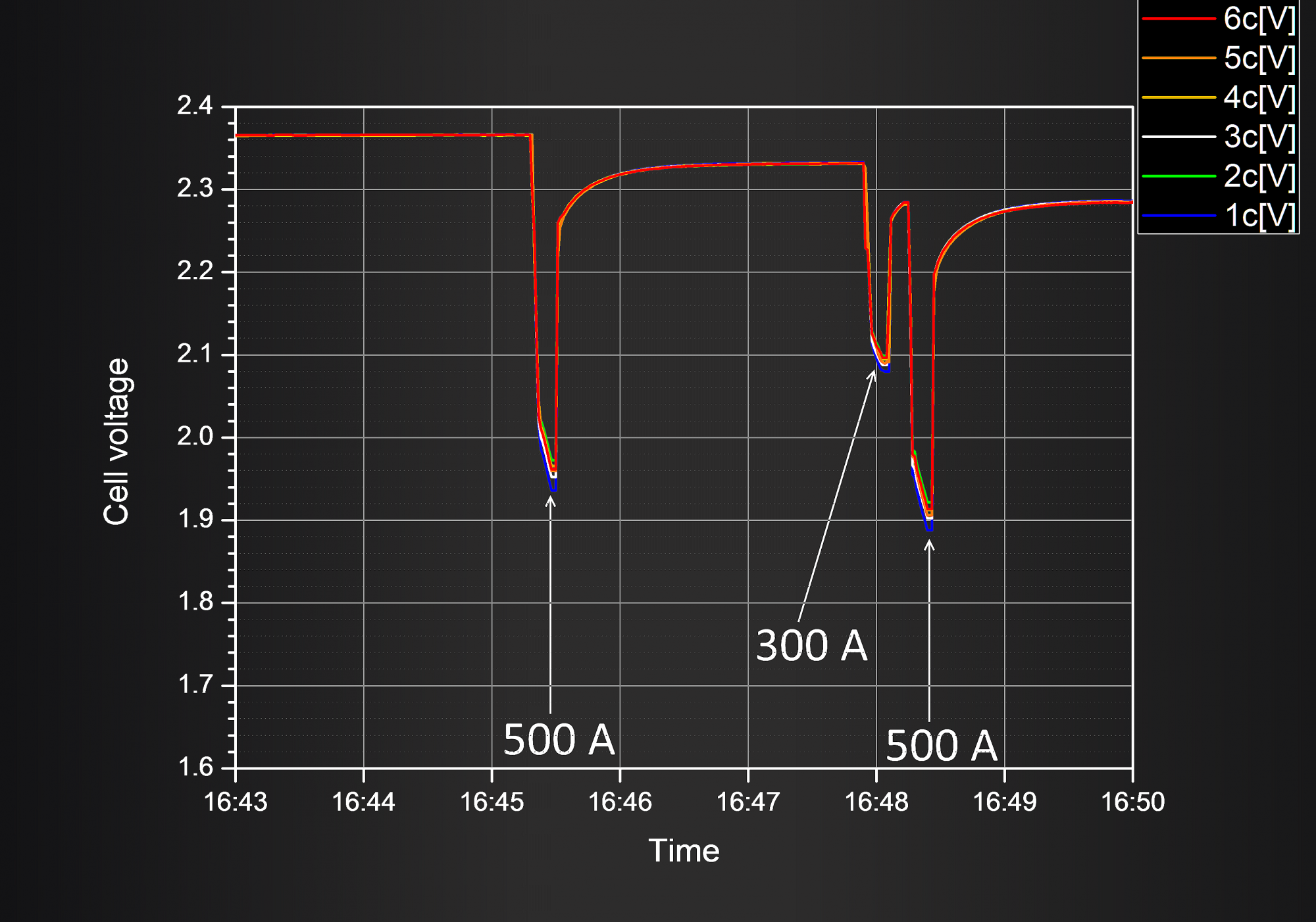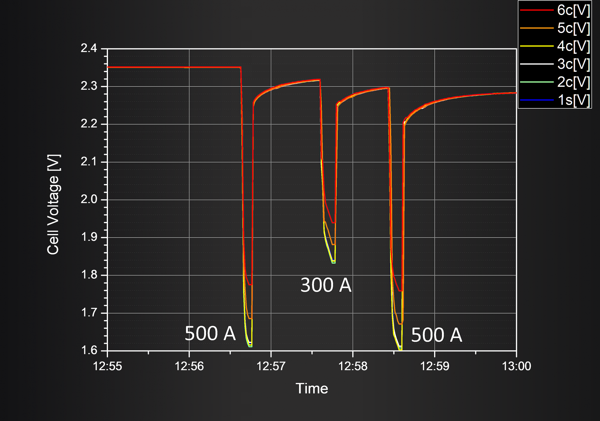 Везде приведён период измерений равный 1 измерению в секунду. Везде порядок следования нагрузочного тока 500А 300А 500А. Температура банок 20 +-2 градуса в обоих нагрузочных тестах.