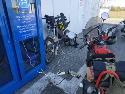 К сожалению, из дома выехал поздновато в 11.40, т.к. до последнего не решался из-за прогнозов погоды. Хоть и выходные, но на Ленинградке пробки никто не отменял... Через 110км пути, проехав Клин, я заехал на первый намеченный мной по плану Газпром (точка В на маршруте). Хорошая коптильня для команды е-байкеров: много розеток, кафе, туалет и Пятерочка рядом. Я сперва подъехал к синему шкафчику, но подошедший местный заправщик любезно предложил мне зарядиться от розетки на их служебной будке.