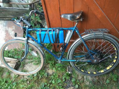 Даа в дополнение. Не понравилась инерционность велосипеда при опрокидывании в сторону. Явно тянет батарея что подвешена с верху. Хочется её в низ засунуть. Именно эта инерционность придаёт ему неудобный вес. Когда он едет не скажешь что он тяжёлый. По бардюрам и раньше на нём не попрыгаешь из-за размера колеса так что сравнивать не с чем. Конечно ещё много чего не доделано. Фару с переди я поставил, но задний фонарь ещё нет. Колебался со схемами подключения аккумулятора. Если использовать один аккумулятор, то удобнее, но дорог драйвер, реле поворота. И не подключишь чего ещё. Если использовать на меньшее напряжение, то либо делать понижайку самому, либо брать отдельный аккумулятор. Мне сейчас намного доступнее взять 18650 4S, соединить последовательно, спаять простенькую схемку на двух транзисторах отключающую батарею от разряда при достижении минимального напряжения и поставить автомобильное реле поворотов. ну или спаять его благо таймер 555 и реле у меня есть. А потом уже доделать понижайку. На данный момент я занят другими проектами. Литиевые акки у меня есть. Валяются. Я их храню, балансирую время от времени, но использовать пока негде. Потом можно либо сделать понижайку, либо сделать зарядку от основного аккумулятора. ХЗ как будет. Поживём увидим.