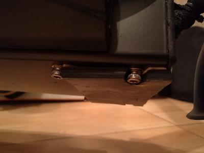 А вот обещанные фотографии тюнинга передней нижней части. Чтобы защитить болты, чтобы при складывании не бился с громким звуком, чтобы пол не царапал - приклеил толстую резинку.