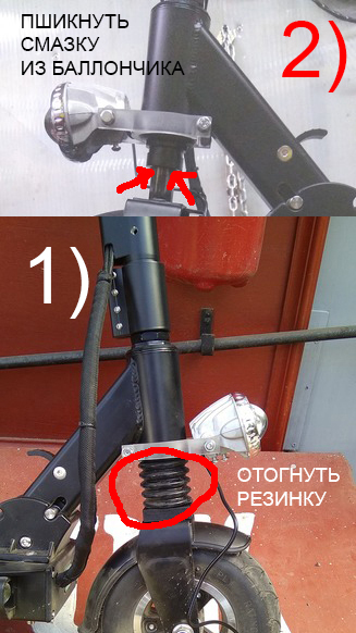 Обычно помогает отогнуть резиновую гармошку и в щель между двумя стержнями обильно пшикнуть из баллончика силикон или тефлоновую смазку от велосипеда (СМ. ФОТО)
