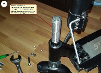 9. Плотно обматываем сантехнической лентой верхнюю часть рулевой направляющей ( труба с нарезанной резьбой), столько сколько потребуется для плотной насадки рулевой стойки