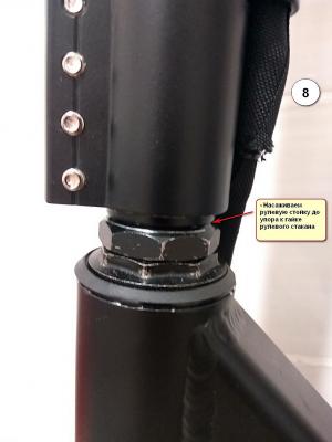 10. Насаживаем рулевую стойку до упора к гайке рулевого стакана, поднимаем руль и центруем весь узел.