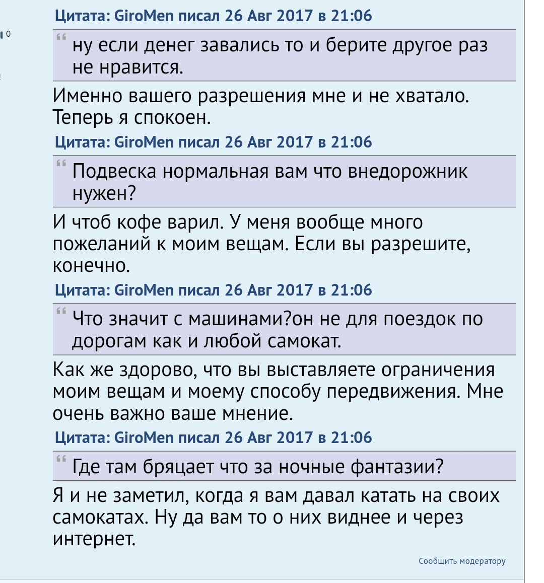 [user]infinite[/user], А по моему это ваши сообщения нужно скинуть модератору.  На форуме вам никто и ничего указать не может в принципе. Вы хозяин своей жизни.  Пытаетесь всем тут доказать свою важность и многозначительность (типа: не говори мне что делать и я не скажу куда тебе идти).  Успокойтесь, нам всем плевать на вас так же как и вам на нас. Это ваши посты с наездами и оскорблениями, не наши.  Нагрубил тут,  да ещё и модератору жалуется на то что дали отпор. Девчачество какое то.