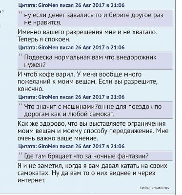 [user]infinite[/user], ну если денег завались то и берите другое раз не нравится.Подвеска нормальная вам что внедорожник нужен?Что значит с машинами?он не для поездок по дорогам как и любой самокат.Где там бряцает что за ночные фантазии?