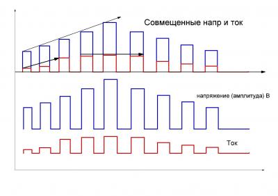 Синий - это напряжение импульса, а красный это ток на шунте .  Напряжение увеличивается с заданным значением (0,01В), но ток может меняться от импульса к импульсу..  и как только ток начнет стабилизироваться, т.е. перестает расти  (пытался показать на совмещенном графике напр и тока), напряжение нужно опять, ступенчато уменьшать..  таким образом ХИТ (химический источник тока) будет всегда получать столько тока, сколько он может переварить".. (взять) -  не больше и не меньше.