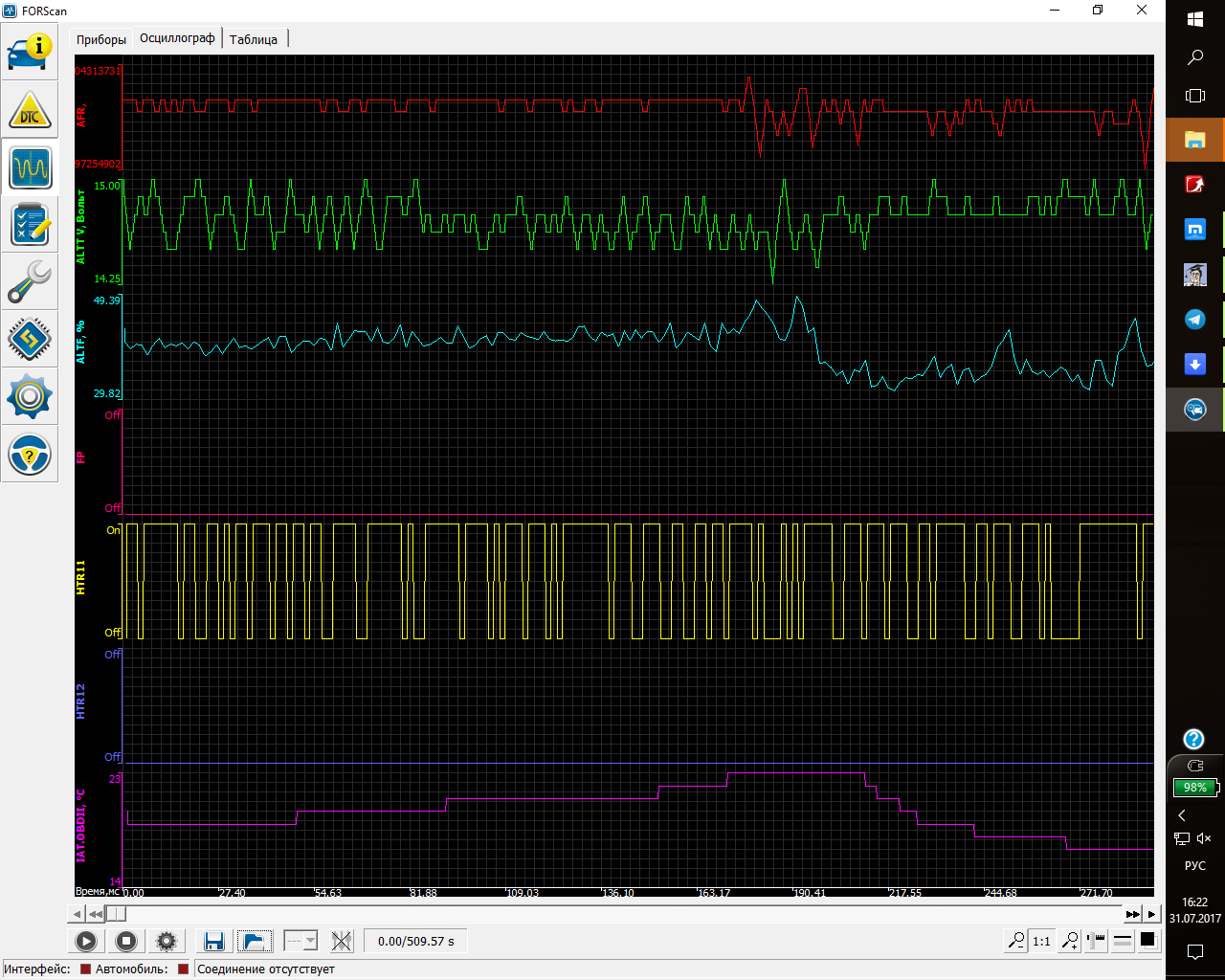 А вот тут хорошо видно, когда мотор молотит на месте на холостом х, то температура ползёт вверх (малиновый), а напряжение вниз (зелёный). Но в любом случае, напряжение на генераторе регулируется скачкообразно (голубой график).