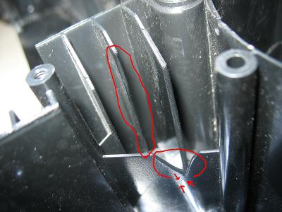 И вот что за пальцами, просто нет одного ребра жесткости. Стрелками обозначил развитие трещины из-за дефекта: