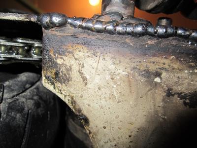 Хотел было поменять самокат на новый, этот начал ржаветь, отваливаться местами, трескаться рама, все дребезжать, было решено перебрать его полностью, кроме переднего амортизатора, довести немного до ума, а после прошедшей метели, когда снега намело столько, что машины с трудом проезжали, а самокат ехал практически хорошо, за исключением некоторых дорог, где задний слик зарывался в снег, понял, что он мне как родной и не хочу с ним расставаться  :el10: не подвел даже в такую погоду. Приложил руки, заменил задний колесный диск, ось, ведущую звезду, съездил в мото мастерскую, приварили крепления амортизаторов, трещина была порядком, вот не заметь ее в пути, аморт мог выстрелить пулей, как это было с левой стороны, но спасибо ребятам, заварили как надо, обращаюсь к ним уже второй раз, разобрал вощем та, смазал все узлы, перебрал сзади подшипники, натяжители цепи пришлось вернуть на место, но в пути один из них выбило, ехал 5 км\ч из-за 6 рублевой выбившей гайки  %-) от нее зависит натянута цепь или нет, передок слегка полирнул, дабы вид преобразовался, теперь блестит, ну это до первой снежной каши  /:-)