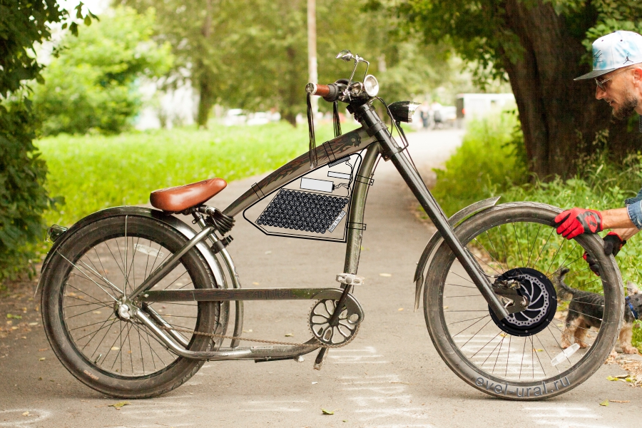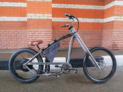 База (рама) - Nirve Cannibal. Мотор 1500 ватт, максималка 60 км/ч. Пока что дешман-вариант с сумкой и баткой на 10 Ач. Заднее колесо 24х3 с ободом 80 мм.  Тормоз через адаптер. Контроллер разместил так чтобы не нарушал ажурности линий  :-)