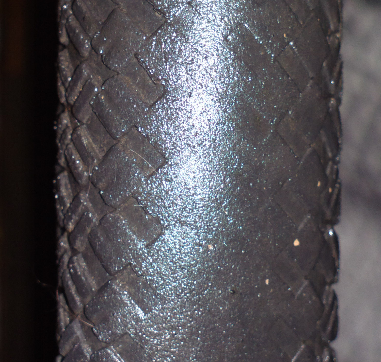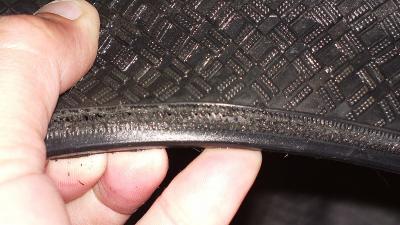 Край покрышки,контактирующий с ободом - отслаивается,дырявый.