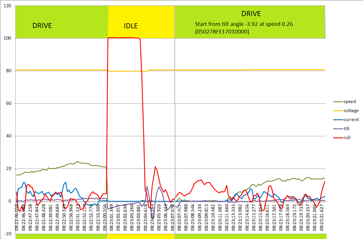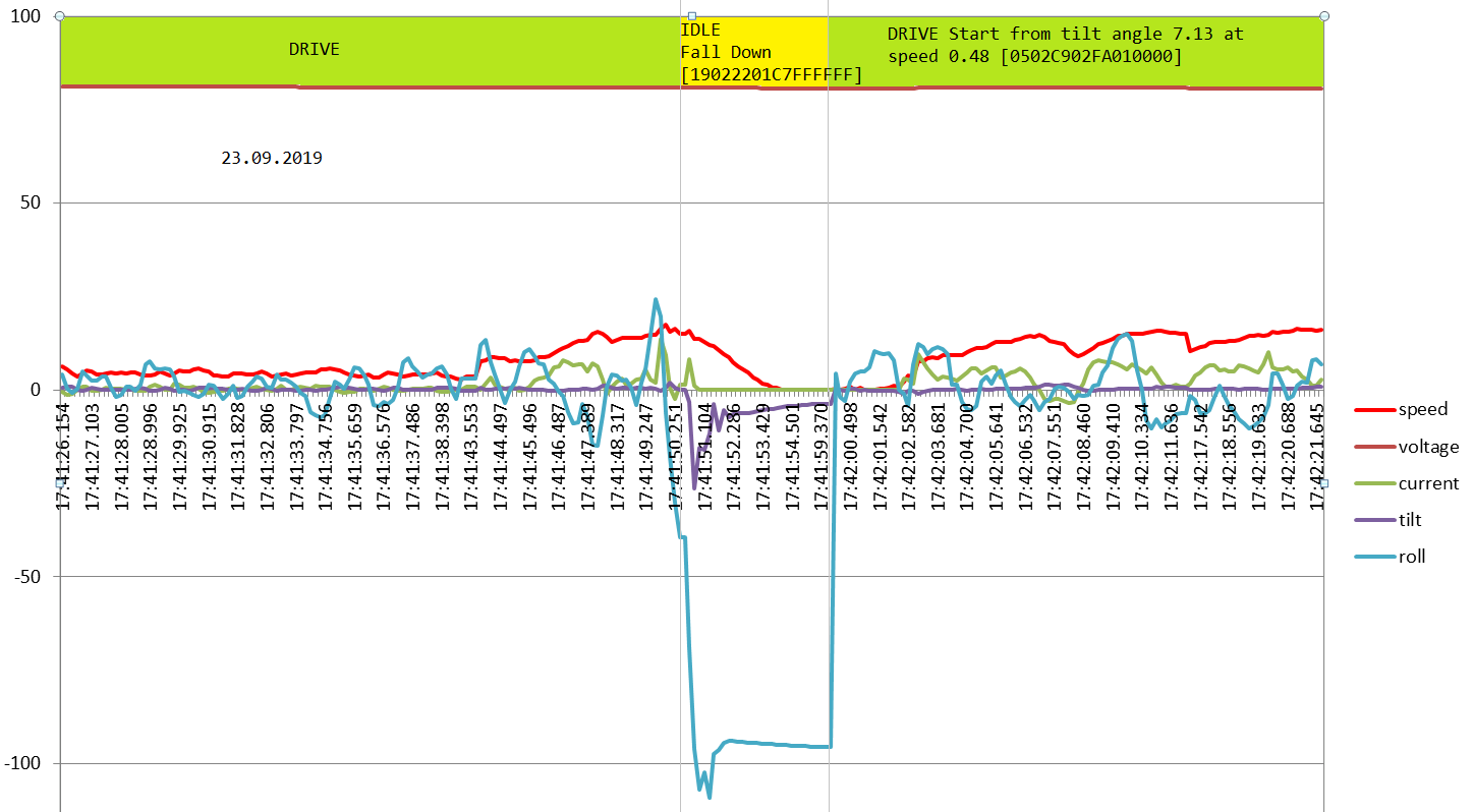 Здесь педали клюют вниз, колесо валится на бок. И здесь и на первом графике колесо вырубается (ну или переходит в режим IDLE), двигаясь на скорости. Нет никаких бросков тока и напряжения. Если это "ошибка райдера", то какая? Не знаю, какое приложение здесь всё время упоминается, в качестве виновника (причём здесь прога?), но, если вспомнить ещё и камрада Игоря из Владивостока, то мне как-то тревожно становится за владельцев INMO V8.