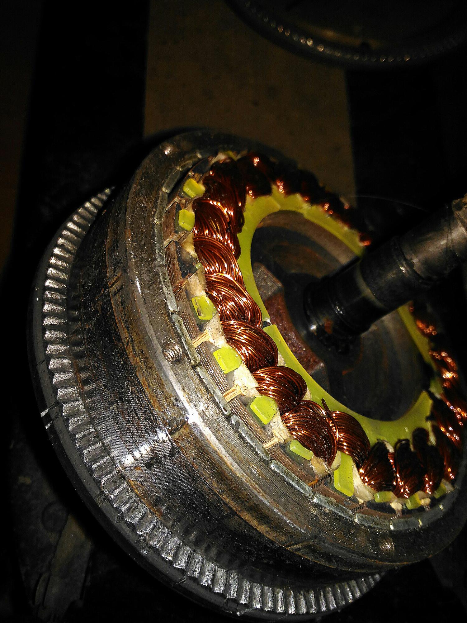 пробег около 1400км, режим эксплуатации - нужно быстрей доехать, со всеми вытекаюшими, ничего не лачилось, не герметилось. греется всегда прилично, остывает долго. следы нагрева видны на пластиковой обойме обмоток(трещины). разбирал 3 раза, первый после где то ста км, посмотреть что там и как, второй раз где то 800-900км наездил, это фото после зимнего отстоя.