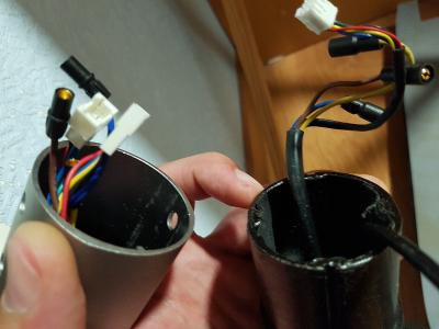 Выкручиваем 4 винта (2 спереди и 2 под пломбой со стороны деки) на рулевой стойке и снимаем верхнюю трубу, отсоединив фишки проводов. В стойке видим паз с короновидной гайкой, под которую нам нужно изготовить спец ключик.