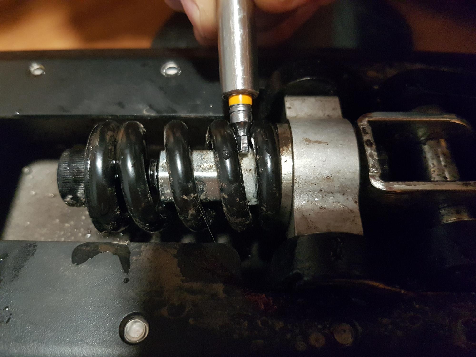 Раскручиваем болт преднатяга пружины. Конструкция неудобна для большинства ключей, но в шестигранную головку  хорошо и плотно садится квадратик 1/4  ;-)