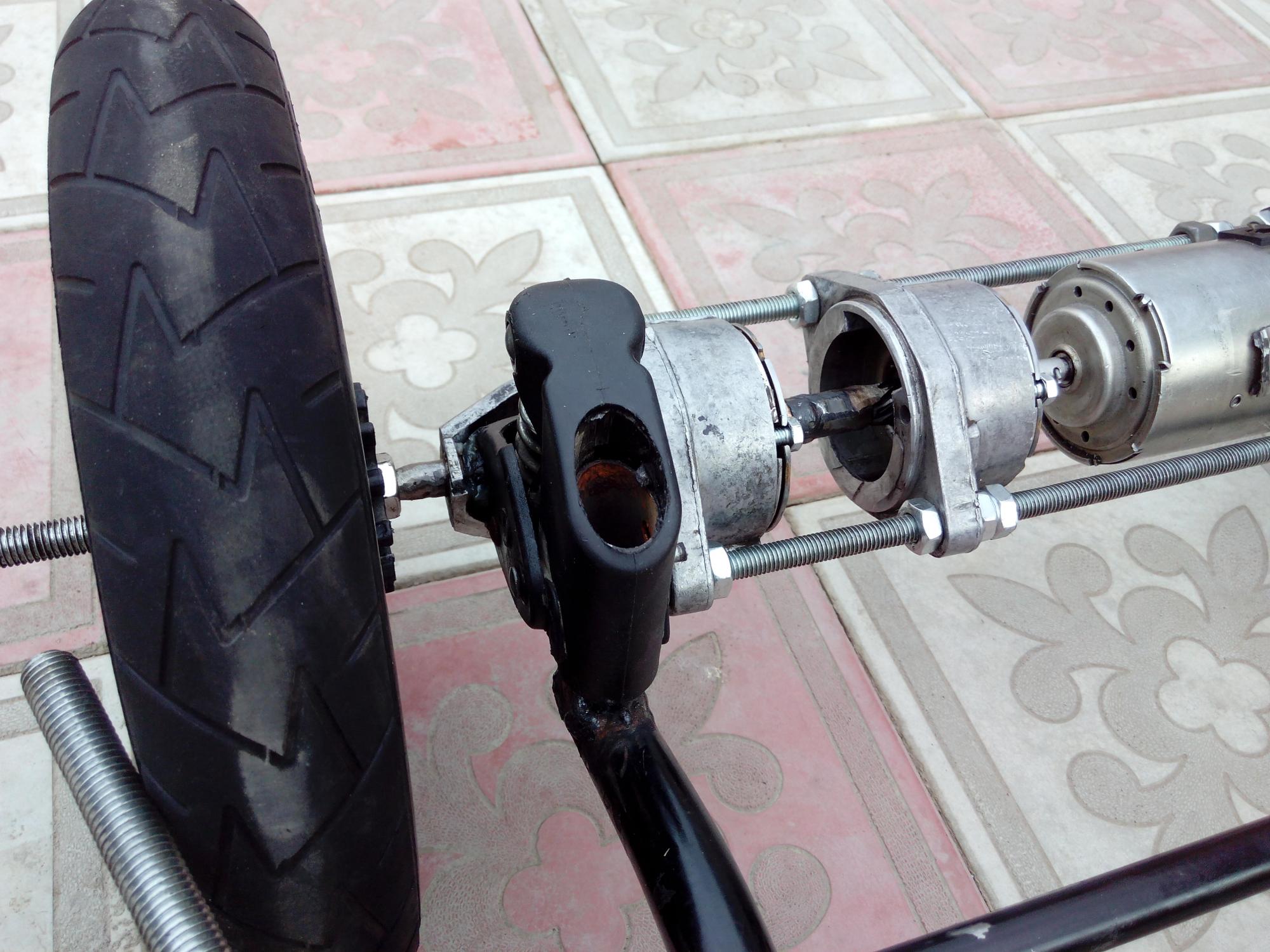 конструкция получилась монстровская.  приводная часть висит на той же самой оси что и колеса. конструкциия оригинальная, но неподресоренная масса большая. при хорошем старте узкие колеса будут проворачиваться.  да и для всей конструкции такой ширины оч сложно выглядит право на одно колесо.  крепеж  у левой оси не очень красиво выполнен. провернется? это как на двухколесных надо усилитель дропаута. вообще все редукторы и двиг хорошо бы на направляющие и связать с втулками колес.