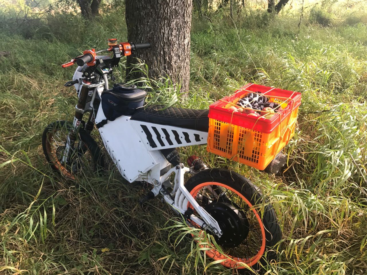 Байк: рама -Чоботар, мотор MagicPie3 перемотанный под 72В с чупасосом (3 кулера в моторе) в литом 20" ободе с бескамерной 16" мото покрышкой, переднее колесо вело 24" с Хуквормом, контроллер Adaptto Mini-E, АКБ 20S18P 72В63Ач (360шт LG MJ1).