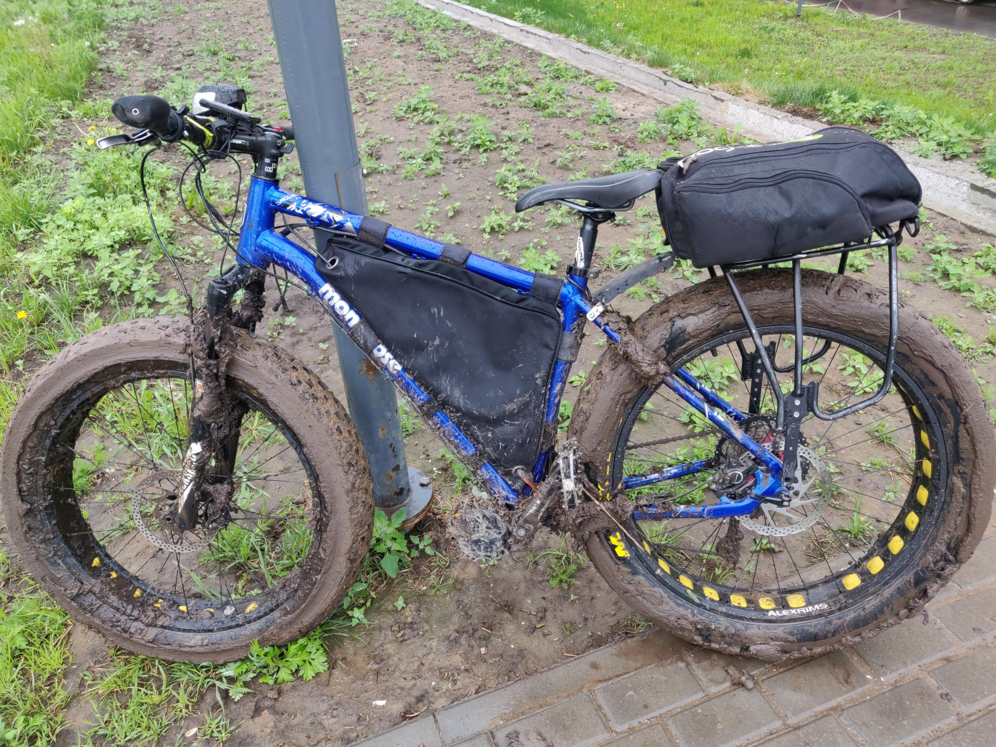 на фэте было не так страшно как на узоте, все таки зацеп лучше и почти не проваливается. вобщем ехал, другое дело что говна махом облепили и летели...  крыло переднее немного помогло бы от потока говен с центральной части колеса, но то что налипает сбоку летит мимо и таких широких крыльев не найти, да и скорее всего мешать будет. были крылья раньше, быстро сломались, сзади багажник с сумкой заместо крыла неплоха работает. поэтому для меня лучший сезон - зимний :)  ну еще конец весны-начало лета и без дождей, пока травы по пояс не наросло.
