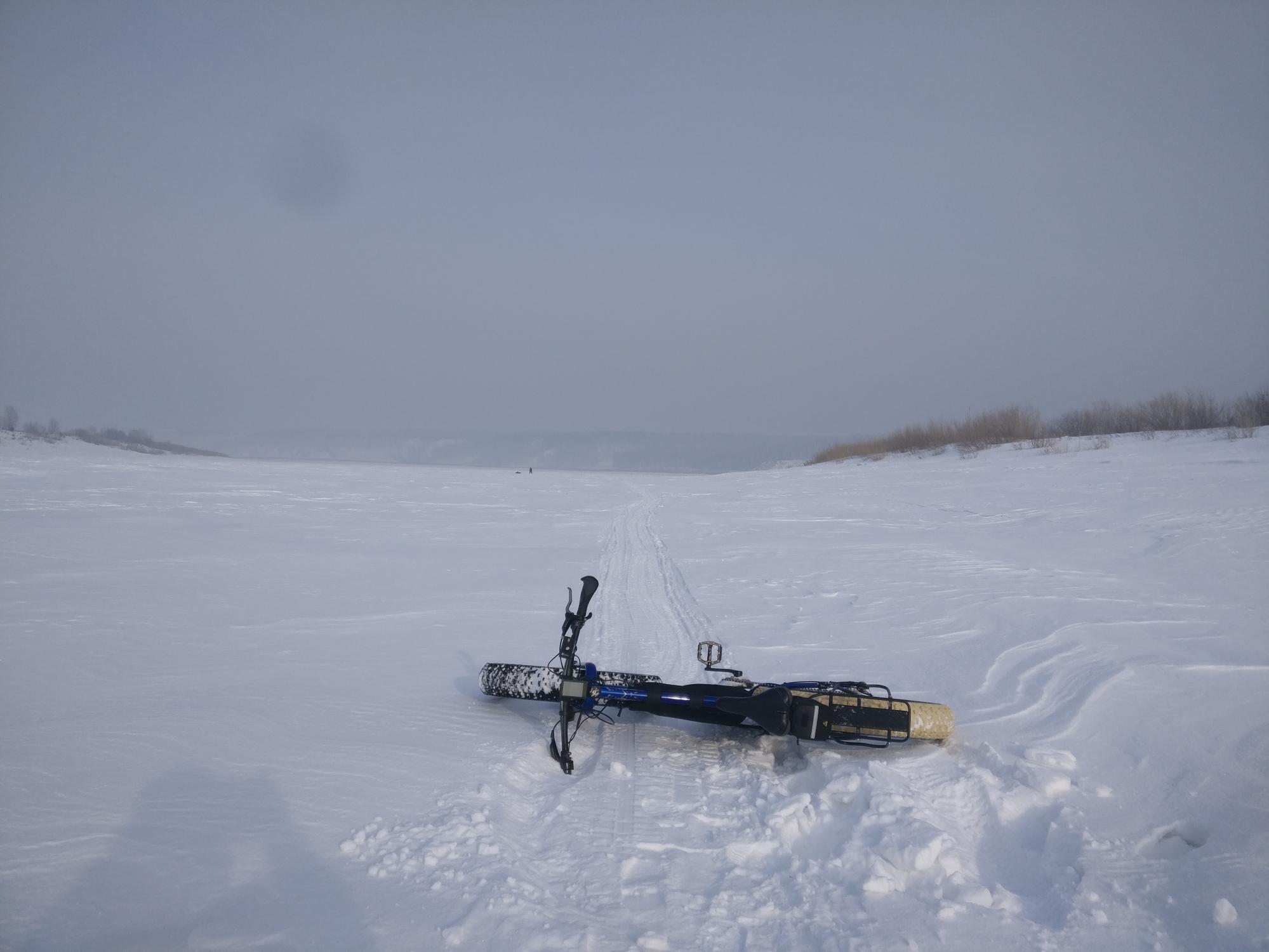 попробовал новую резину, резюме - хня полная. бульдозер маломерка и дубовая. белый 2xl поставил вперед вместо чорной и все. сзади попробовал, на спущеных разбортовывается, бьет и цепляет за перья. одно хорошо, протектор реально гребет и по сыпучему снегу получилось стартовать и проехать там где раньше не мог. но остальное перечеркивает это достоинство. из среднего ценового уровня швальба jj 4.8 самый лучший вариант: мяхкая, сбалансированная, биения минимальны. покатался по реке, по следу от мотособаки вообще асфальт, но и по целине неплохо, лишний снег ветра выдувают и остается наст, велосипедисту ногами тяжко будет, но мотор то есть!  батарейка конеш тает, так что снегоходки без внимания не оставляем, но где-то и срезать можно. на фотке след, это не пухляк, а жесткий снег.
