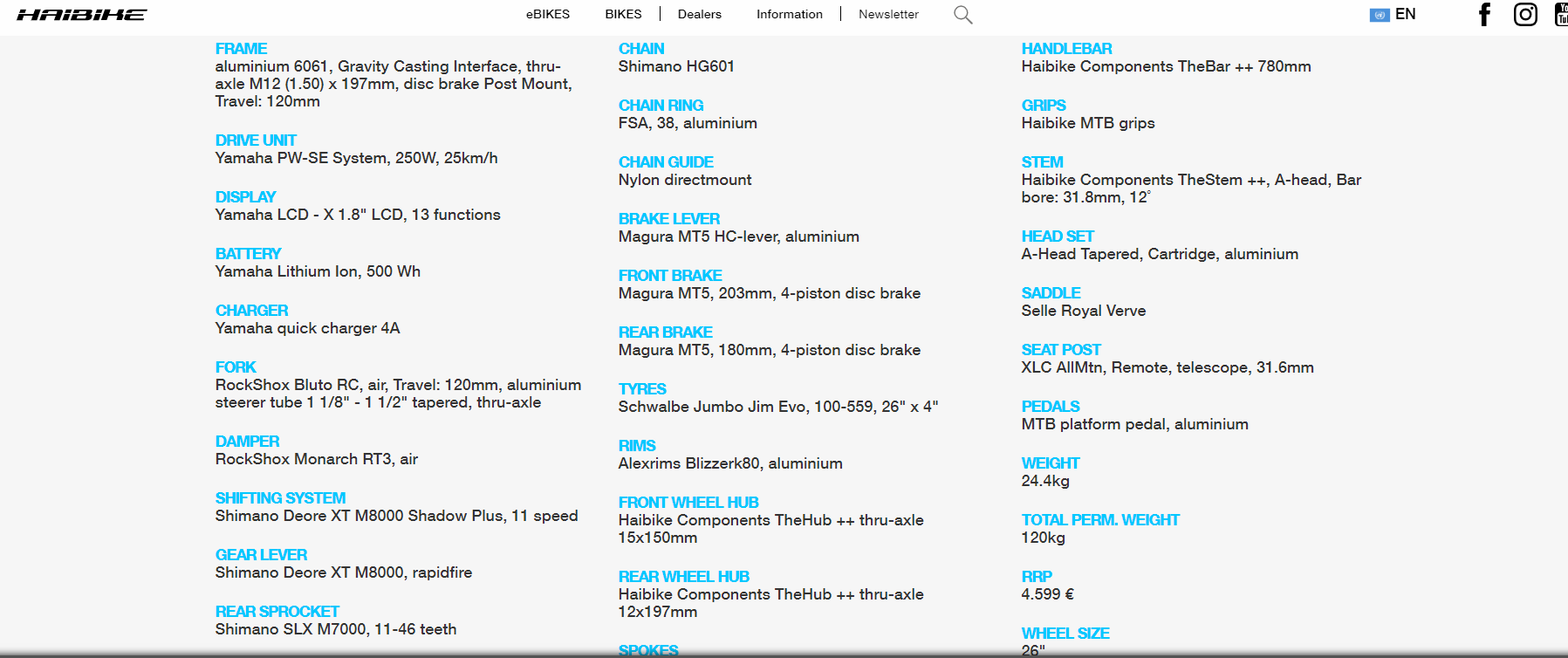 ЦитироватьHaibike Xduro FullFatSix 9.0 500Wh 11s XT – это сверхпроходимый двухподвес, оснащенный оборудованием профессионального уровня. Мощный электромотор Yamaha PW-SE System развивает скорость до 25 км/ч, а заряда аккумулятора хватит, чтобы проехать расстояние от 30 до 50 км.