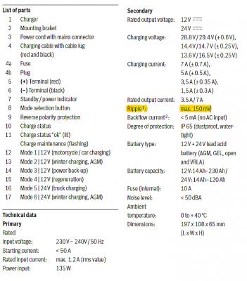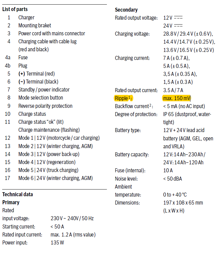 Для товарища Каас, чтобы он дальше не рассказывал что все ЗУ это по сути дедушкин трансформатор с одним диодом, пример нормально спроектированного ЗУ и его технические характеристики Bosch C7