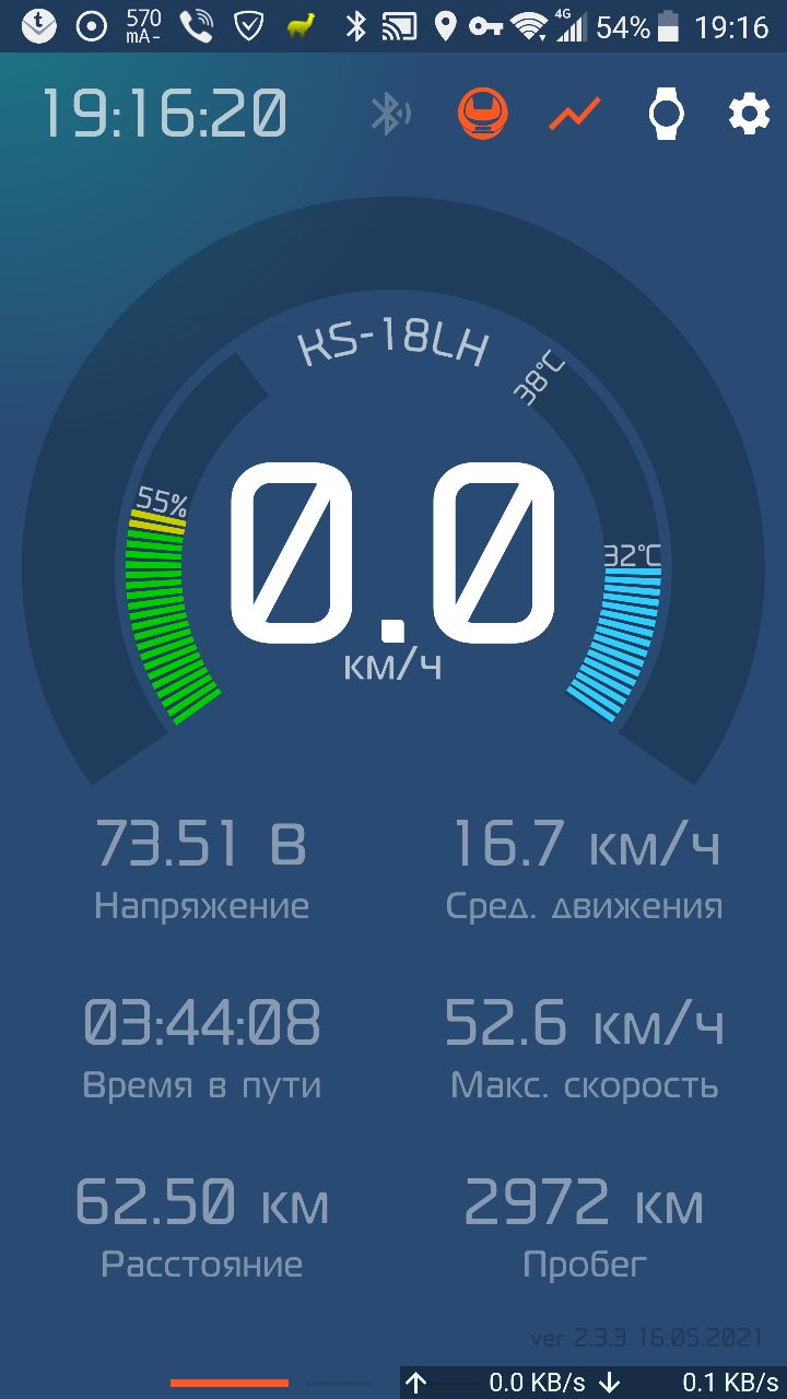 Вот, вчера ездил по Москве, 62.5 км по контроллеру (читайте около 60), остаток 55% по офиц. приложению, напряжение 73.5 В. Но у меня вес нетто 106-107 кг. Ясно, что график нелинейный и на остатках 55% ещё столько же не проедет. В моём случае, думаю, 90-100 км, у вас больше - 120-130 км.