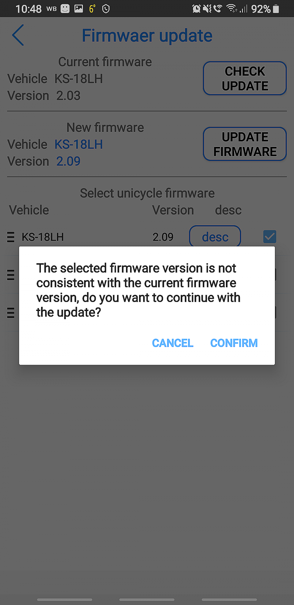 "Выбранная версия прошивки не соответствует текущей версии прошивки. Продолжить обновление?"