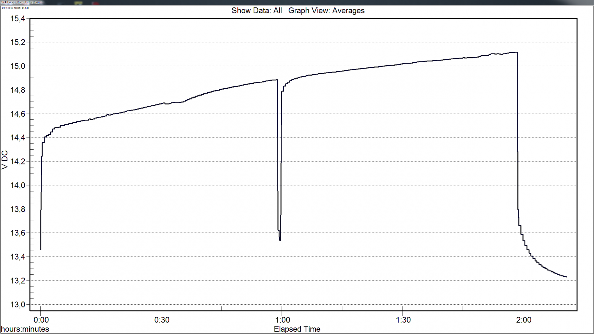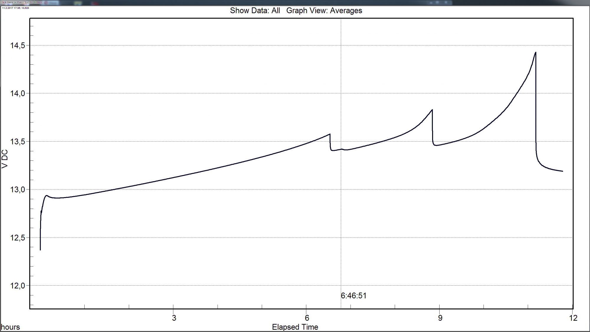 [user]UDAV[/user], АКБ отогрелся, после КТЦ был повторно заряжен в стандартном режиме (ступенчатый CC) до 14,4В. Затем два выравнивающих заряда по часу током 1,6А. Максимальное напряжение в конце второго часа всего 15,1 В, можно увидеть на графике. Суммарное время затраченное на основной и выравнивающий заряд - 12 часов.